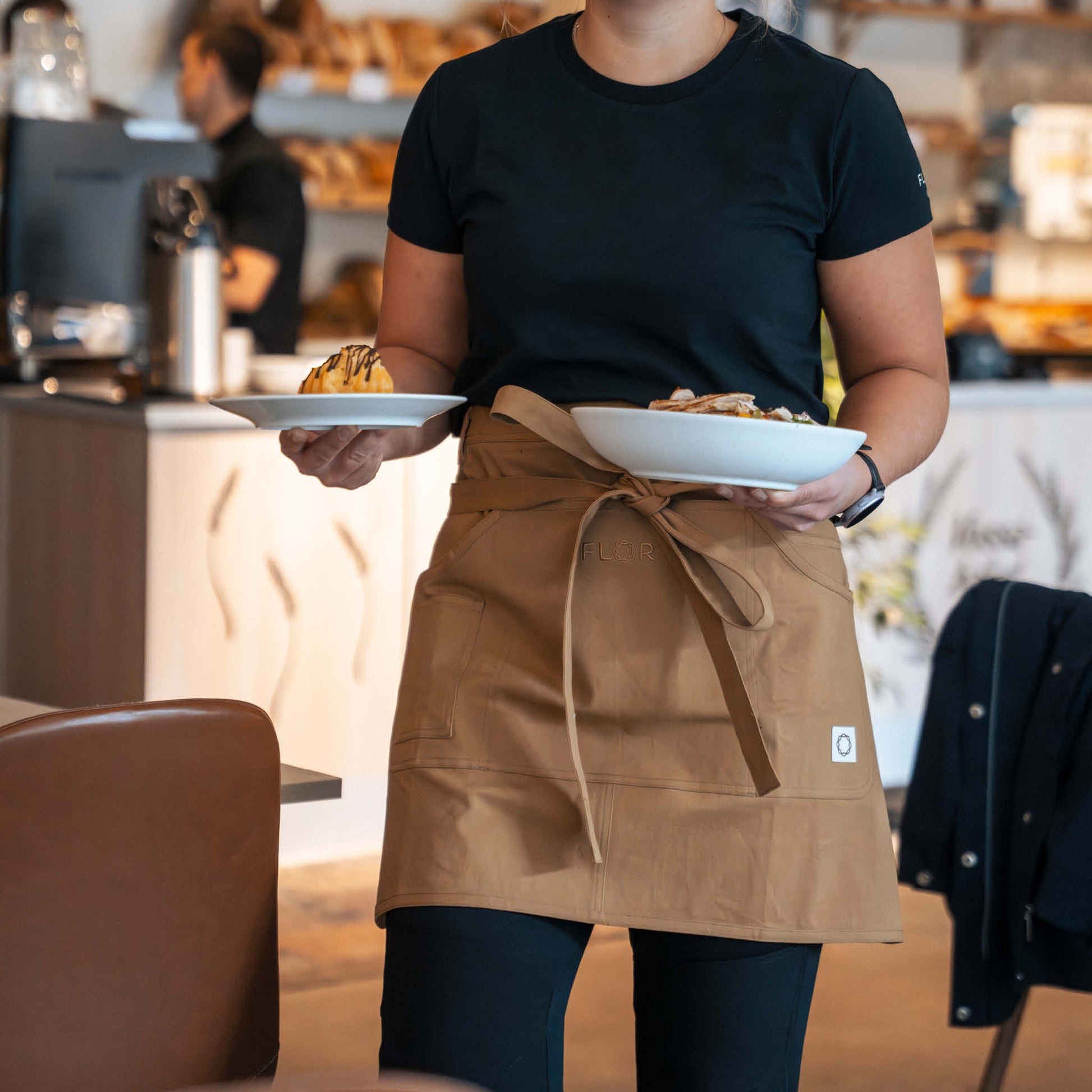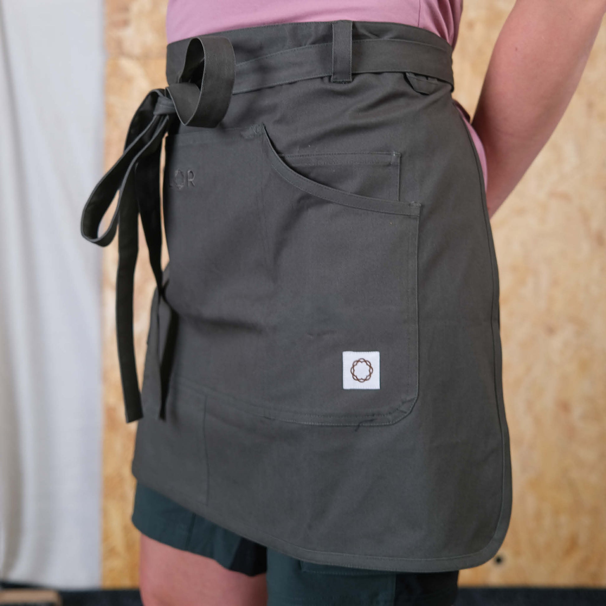 Vårt funksjonelle arbeidsforkle er laget i behagelig bomull med stretch slik at det er godt å bevege seg i, og opplevest mykt. Vårt korte forkle er bredt og har mange lommer som kan romme redskap og alt du måtte trenge.